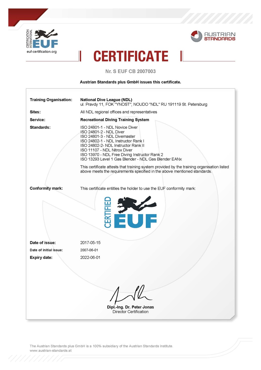 Национальная Дайв Лига является полноправным членом Европейской Подводной Федерации (EUF), а ее программы соответствуют международным стандартам ISO и EN.